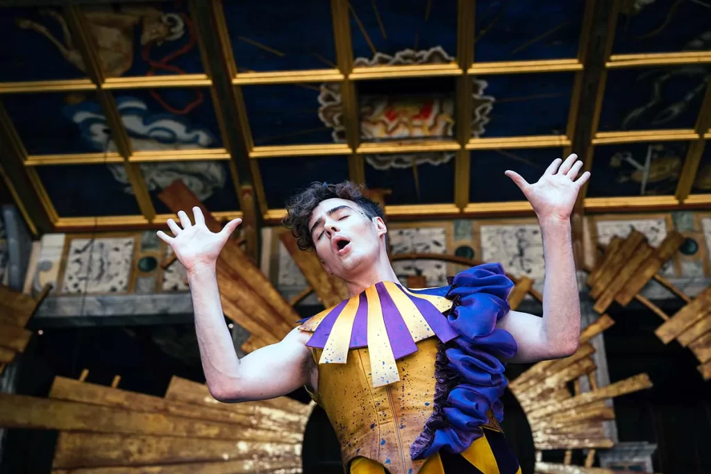 The Fool, in Harlequin’s attire as the central figure of this production of Twelfth Night, probably tells you all you need to know about Belfield’s direction for this staging – vibrant japery and frivolity lacking nuance or subtlety. It’s all colour, exciting visuals, dance, costumes, revelry and clowning about – something between the Venetian Carnival and Cirque du Soleil, set against the backdrop of a massive, stylised, beaming bronze sun.